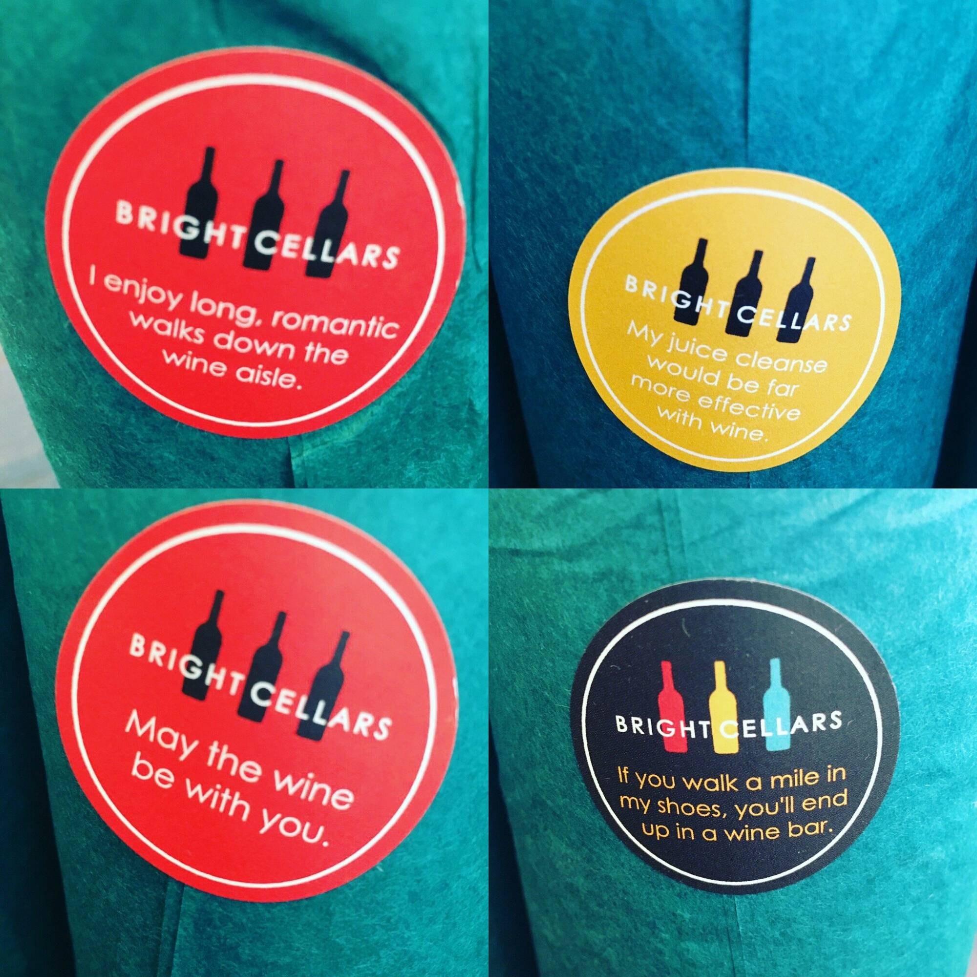First, let’s talk packaging: each bottle comes indivually wrapped in this teal tissue paper held closed with a sticker that has a “wine quip” on it. I can only assume that there are four different stickers. I got five bottles in my first shipment but only four unique stickers. These are a super cute touch! So far, so good. Now onto what’s inside the tissue…
